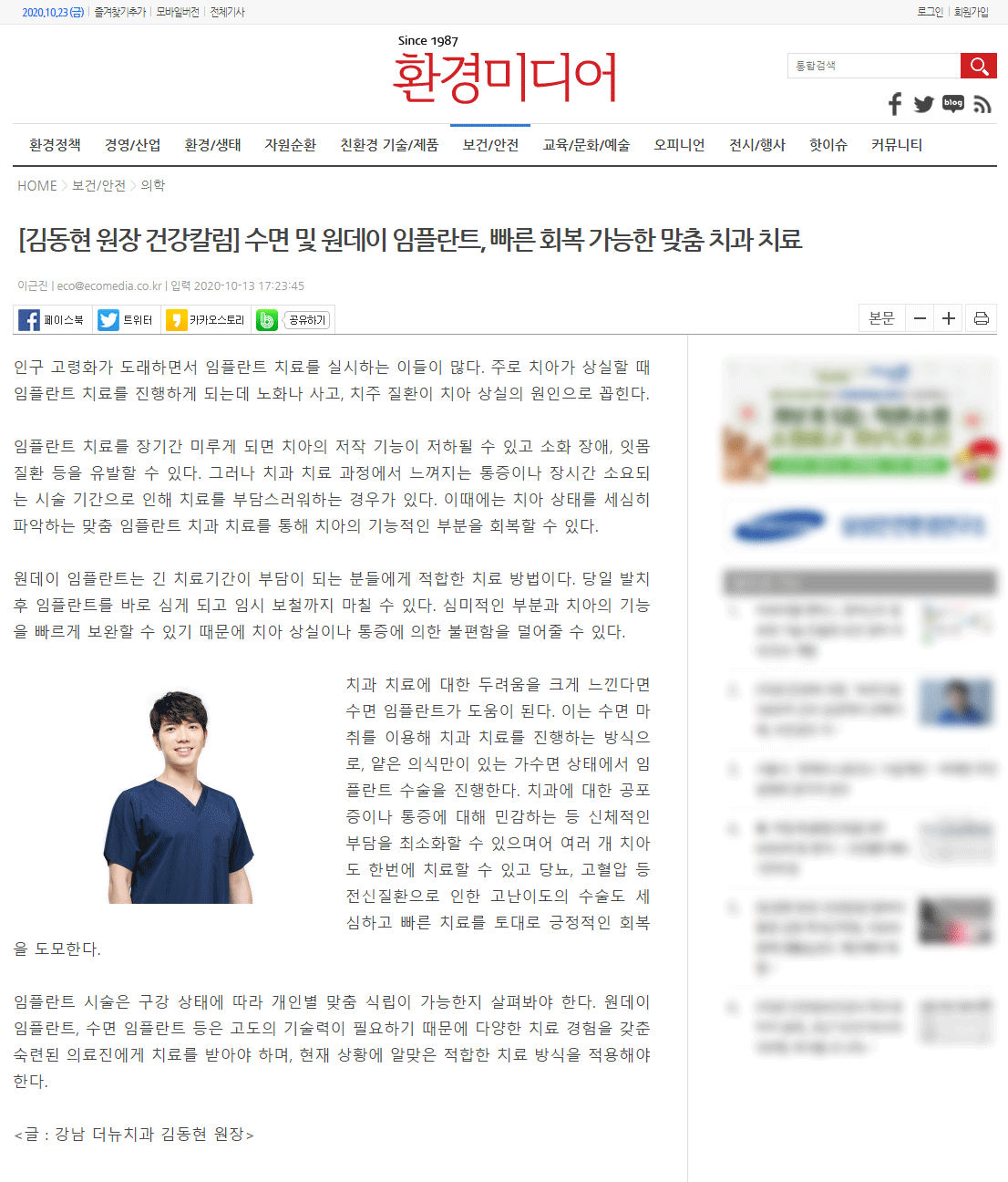 2020년 10월 13일 "환경미디어"를 통해 발행된 김동현 원장님의 임플란트 칼럼 입니다.
