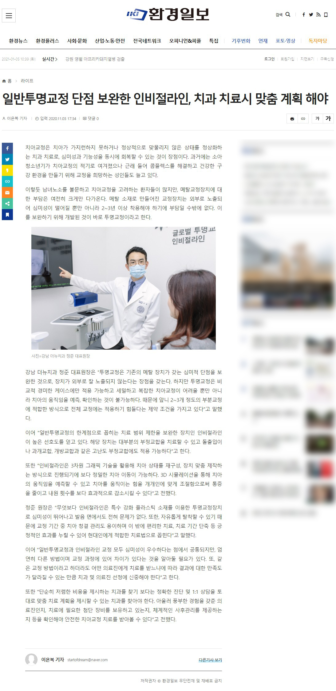 [환경일보] 일반투명교정 단점 보완한 인비절라인, 치과 치료시 맞춤 계획 해야