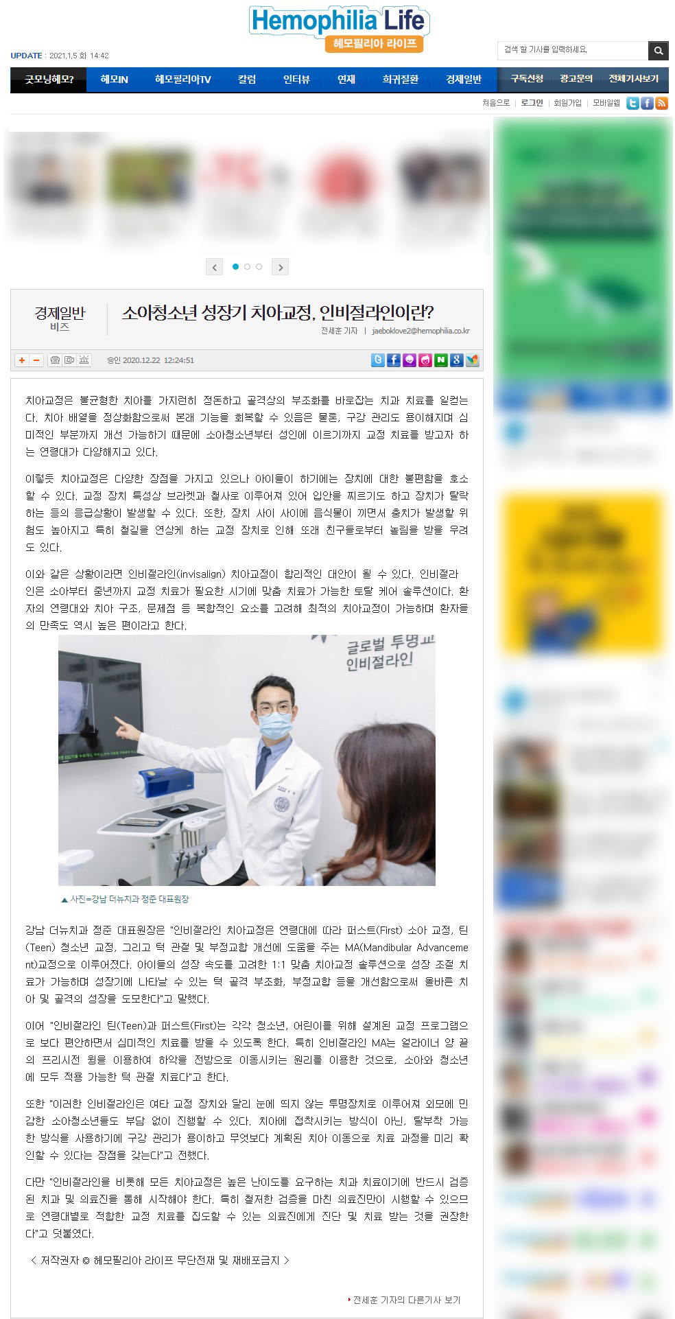 [언론보도] 소아청소년 성장기 치아교정, 인비절라인이란?