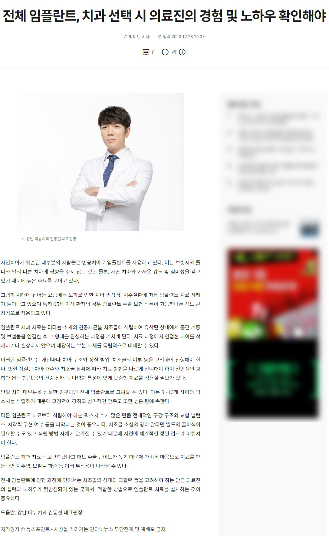 [뉴스포인트] 전체 임플란트, 치과 선택 시 의료진의 경험 및 노하우 확인해야