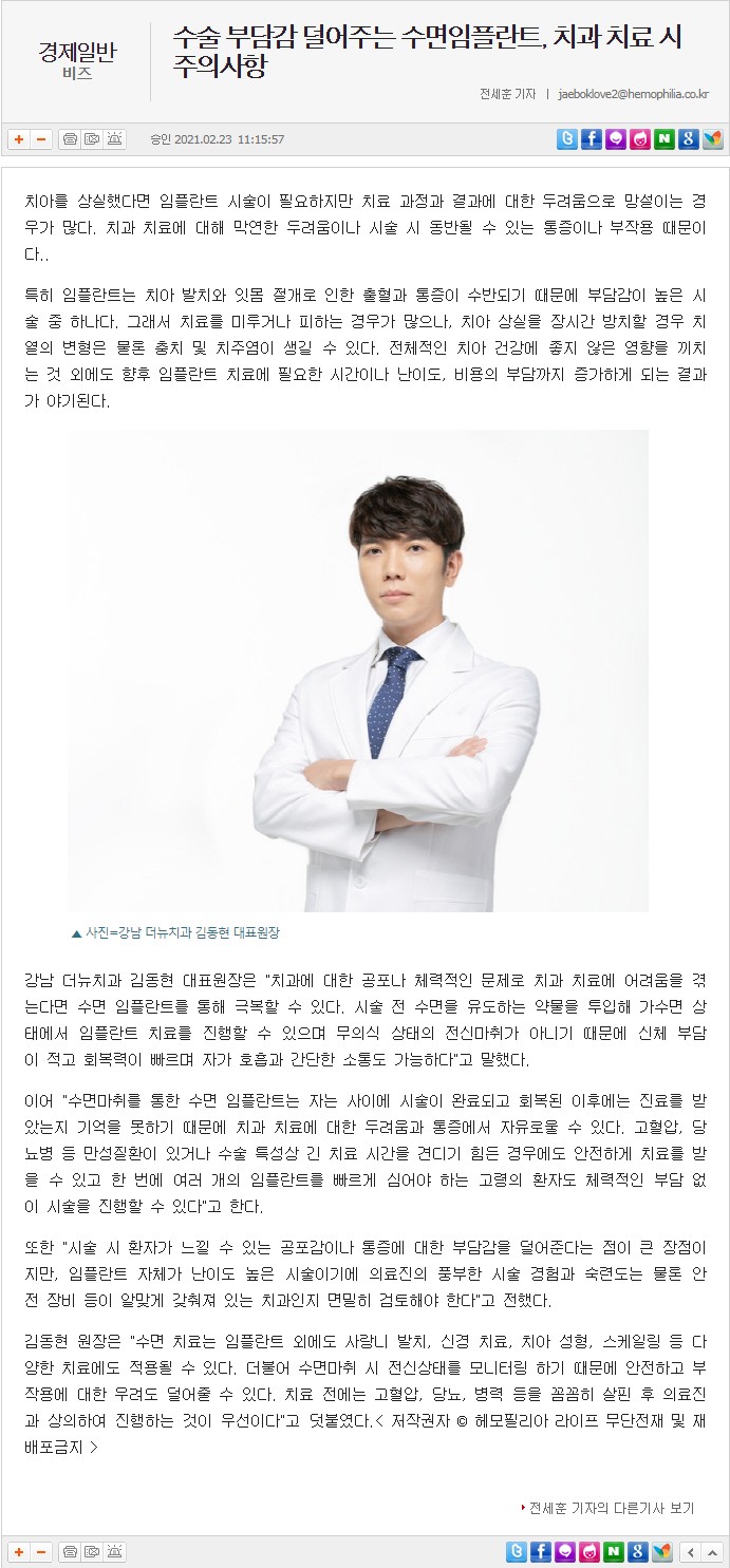 [언론보도] 수술 부담감 덜어주는 수면임플란트, 치과 치료 시 주의사항