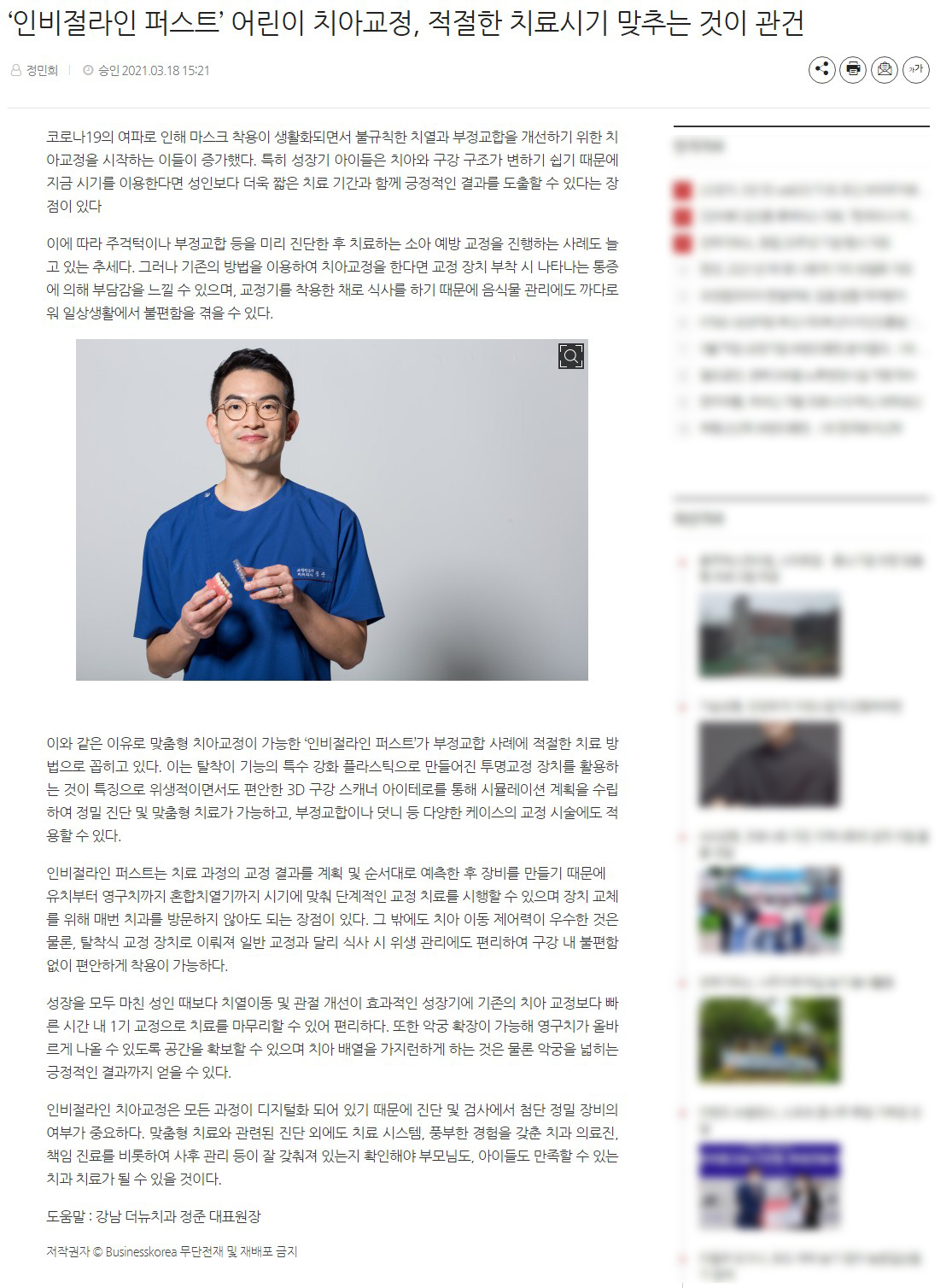 [비즈니스코리아]‘인비절라인 퍼스트’ 어린이 치아교정, 적절한 치료시기 맞추는 것이 관건