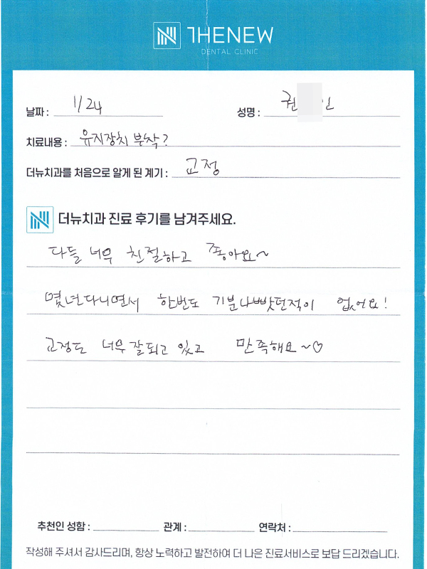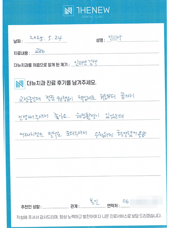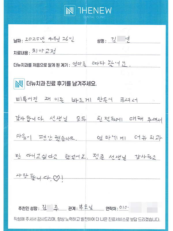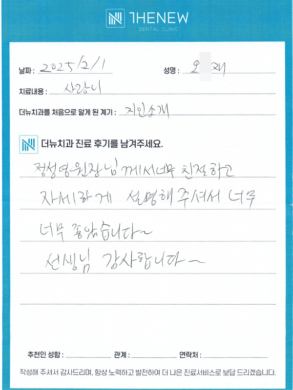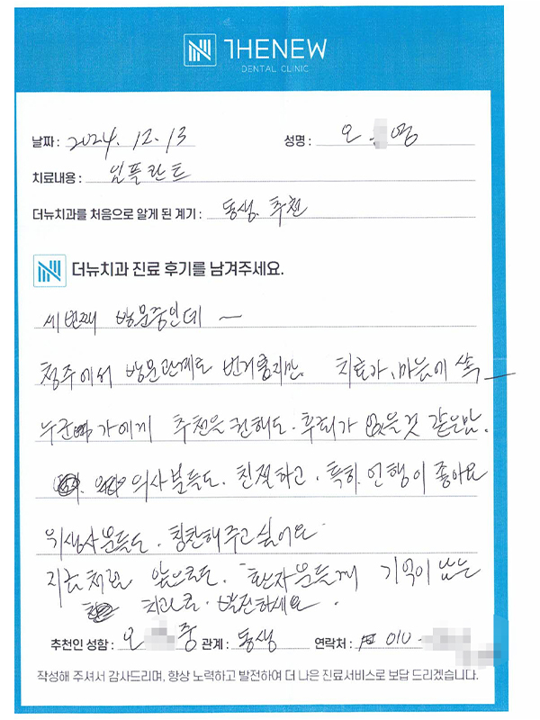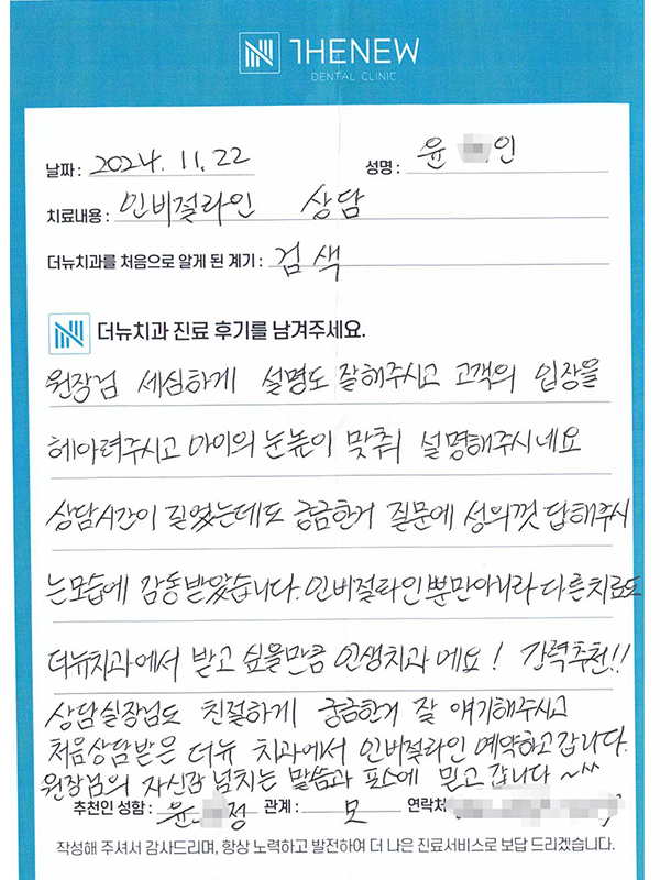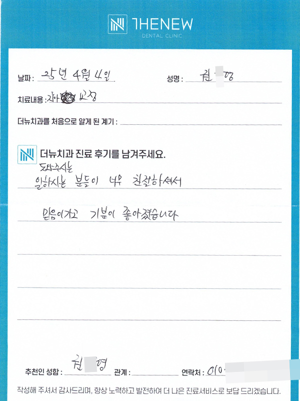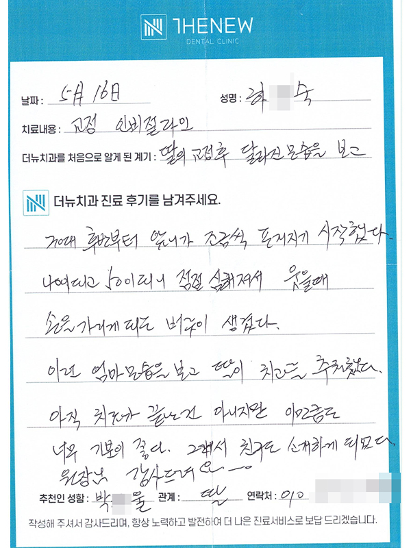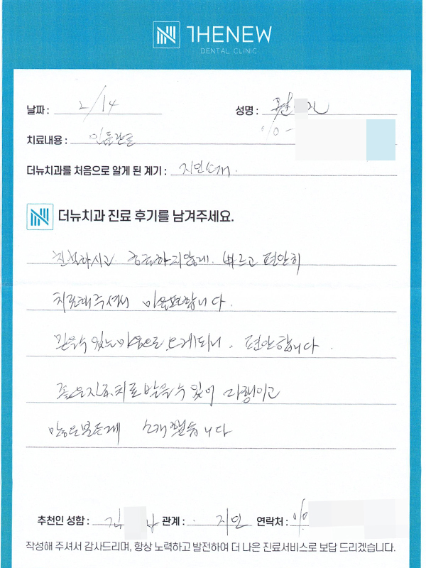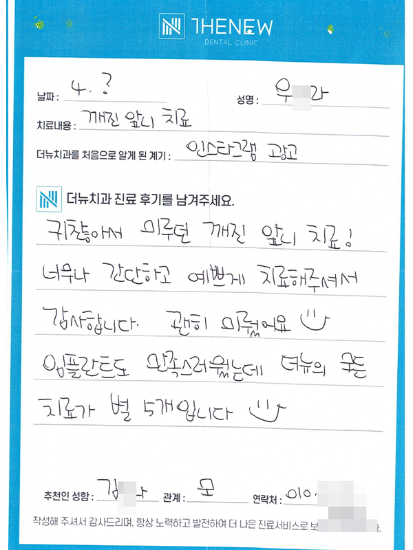 '더뉴치과'은 (이하 '회사'는) 고객님의 개인정보를 중요시하며, "정보통신망 이용촉진 및 정보보호"에 관한 법률을 준수하고 있습니다.