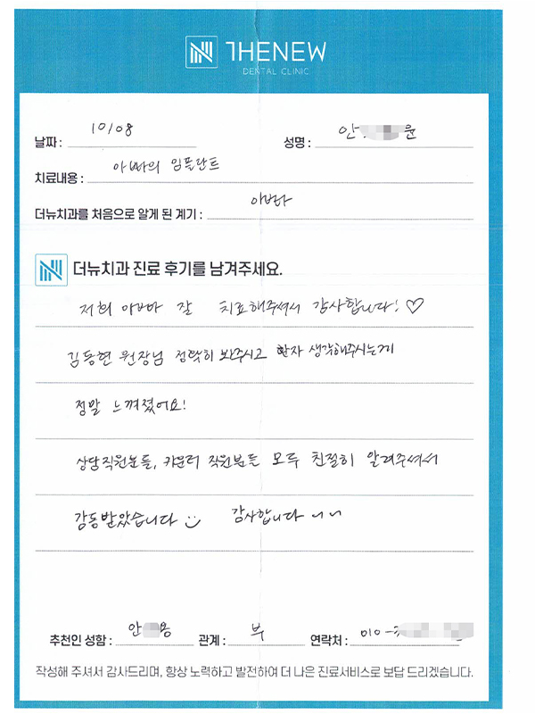 내원해 주신 "안O윤"님께서 직접 작성해주신 후기입니다.
