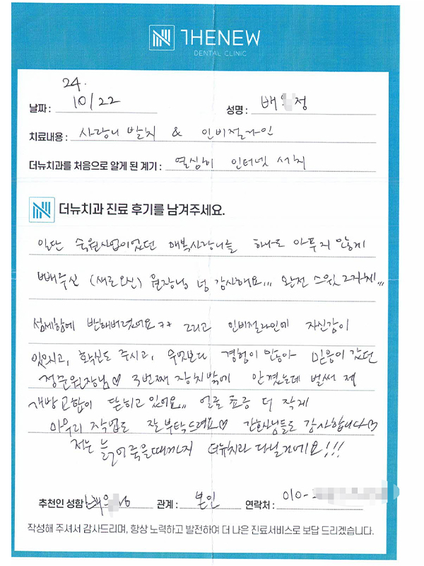 내원해 주신 "배O정"님께서 직접 작성해주신 후기입니다.