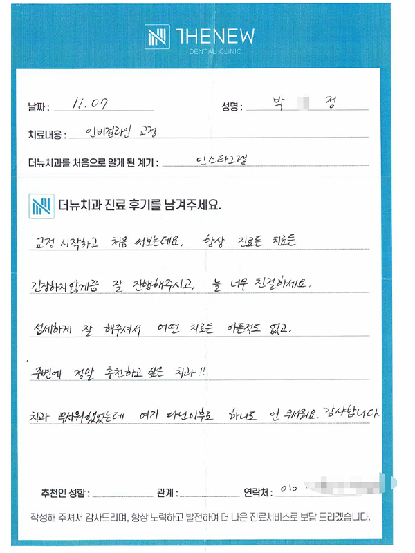 더뉴치과 인스타그램을 보시고 내원해 주신 "박O정"님께서 직접 작성해주신 후기입니다.