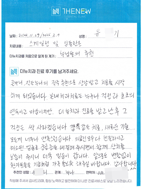 2025년 2월 7일 친 누나분의 소개로 내원 주신 "유O기"님께서 직접 작성해주신 후기입니다. 큰누나, 작은누나의 적극 추천으로 상담받고 치료를 시작하게 되었습니다. 더뉴치과 진료를 받고 난 후 그 걱정은 싹 사라졌습니다.