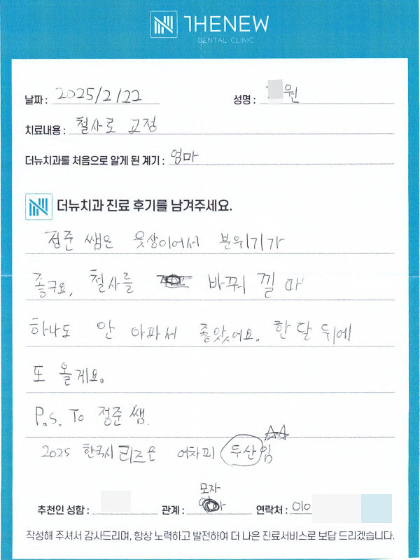 2025년 2월 22일 치아교정 진료로 내원 주신 "O원"님께서 직접 작성해주신 후기입니다. 정준 쌤은 웃상이어서 분위기가 좋구요, 철사를 바꿔 낄 때 하나도 안 아파서 좋았어요. 한달뒤에 또 올게요. ps. to 정준쌤 2025 한국 시리즈은 어차피 두산임