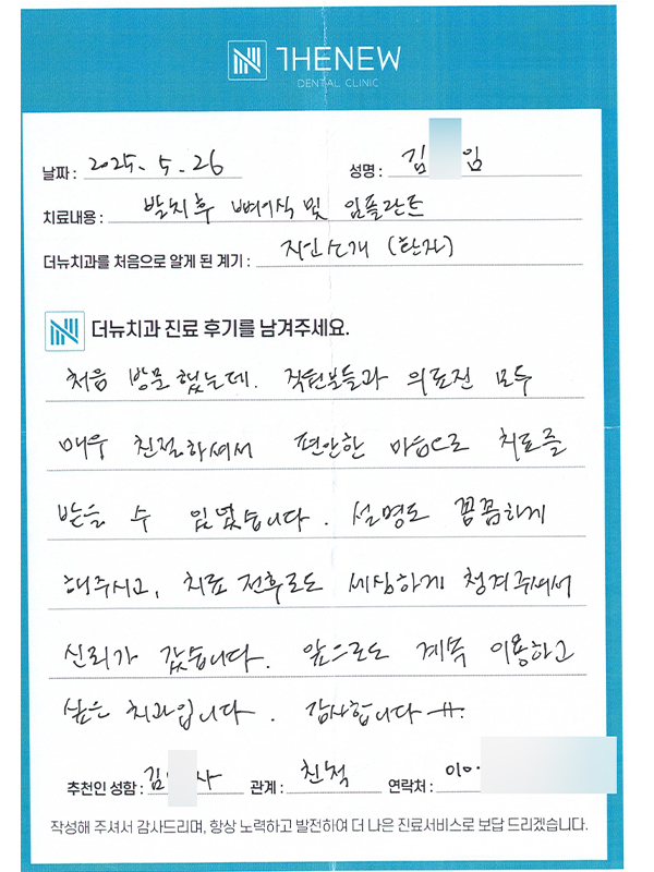 임플란트 치료로 내원 주신 "김O임"님께서 직접 작성해주신 후기입니다.