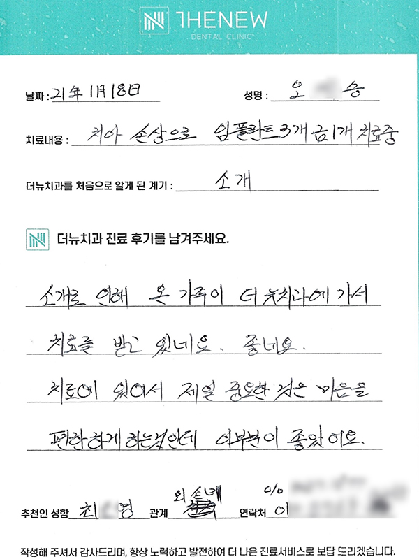 "소개로 인해 온 가족이 더뉴치과에 가서 치료를 받고 있네요. 좋네요.