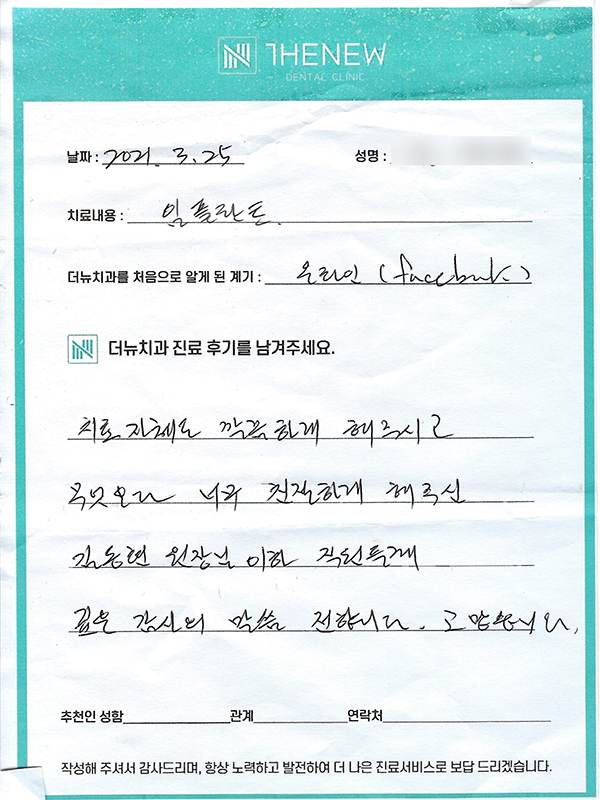 온라인 페이스북을 통해 내원해주신 '김O한'님께서 직접 내원해주시고 작성해주신 후기입니다.