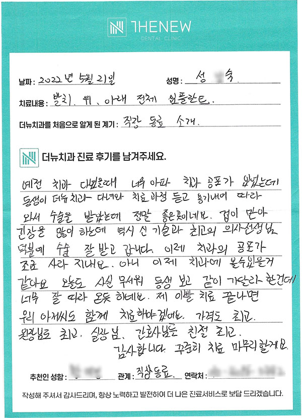 직장 동료 소개를 통해 내원해 주신 "성O숙"님께서 직접 작성해주신 후기입니다.