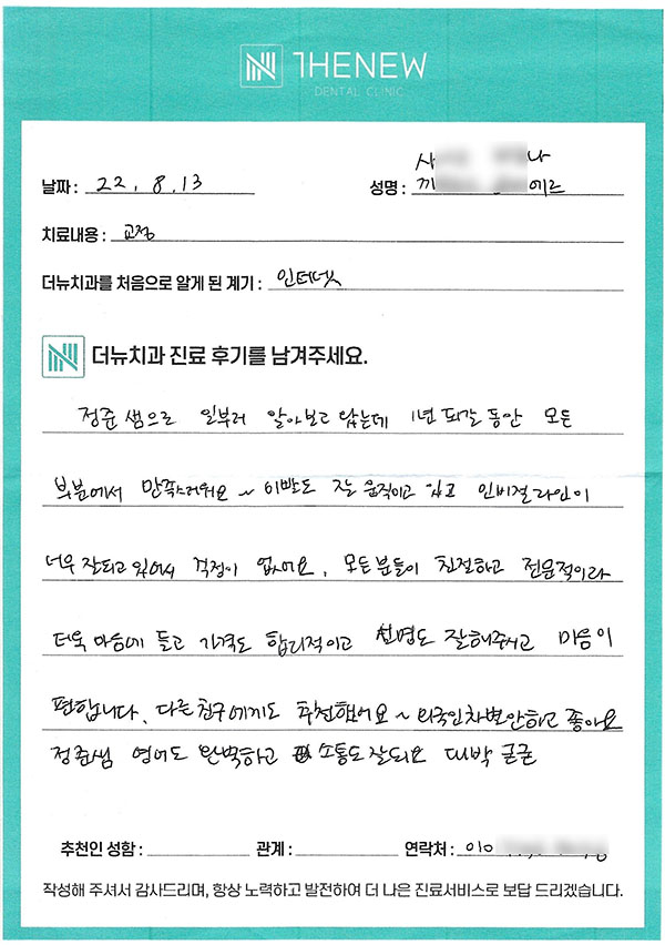 인터넷을 통해 내원해 주신 "사OO OO나", 까OOO OO에르"님께서 직접 작성해주신 후기입니다.