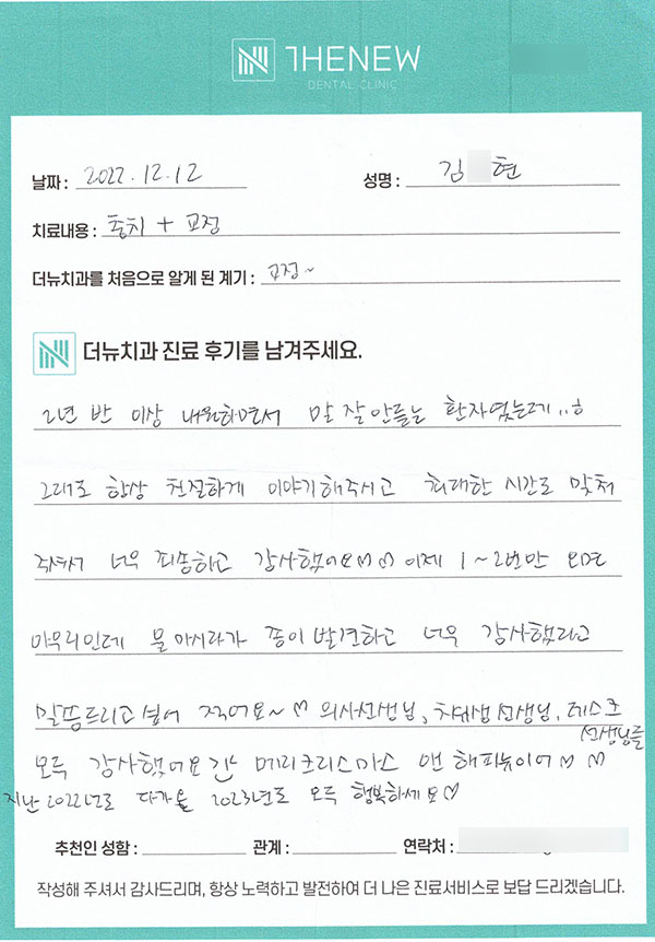충치와 교정치료를 위해 내원 해주신 "김O현"님께서 직접 작성해주신 후기입니다.
