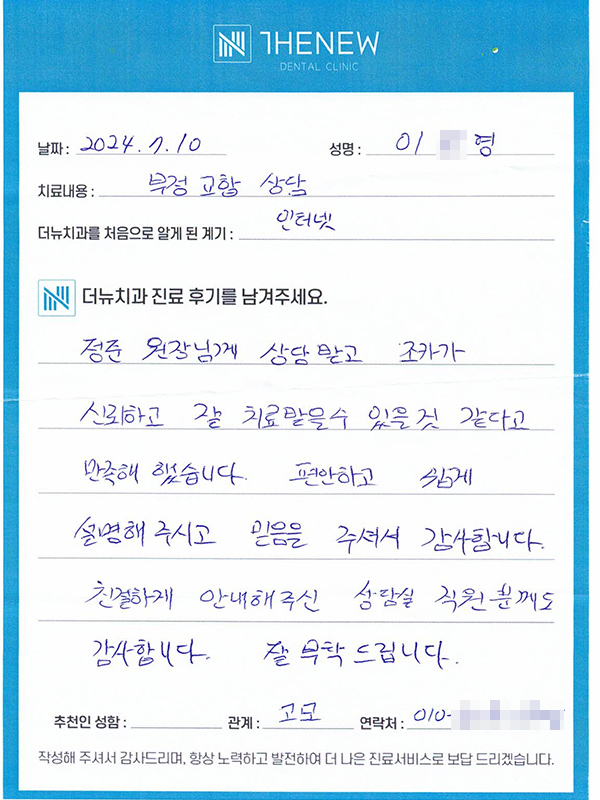 내원해 주신 "이O영"님께서 직접 작성해주신 후기입니다.