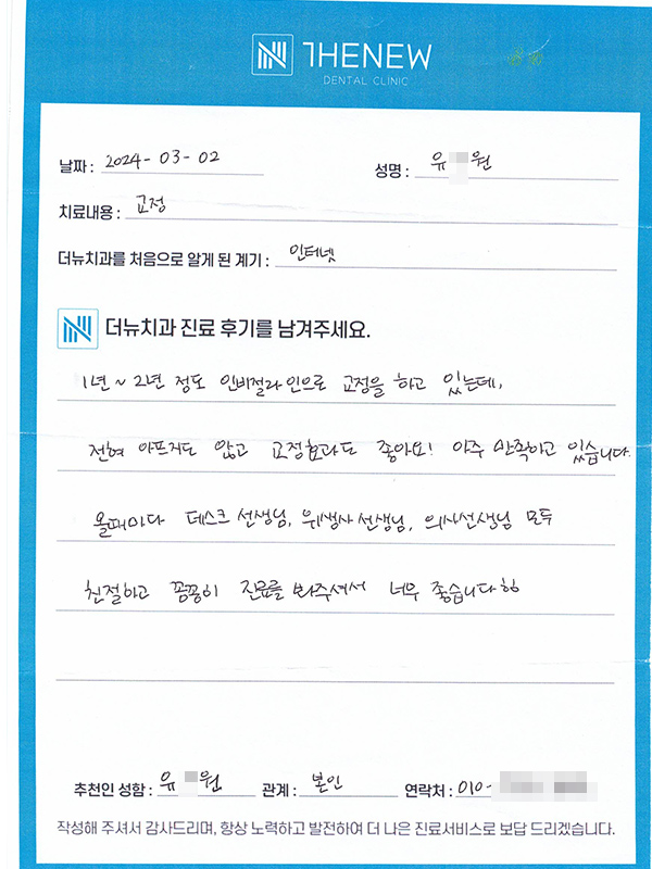 2024년 3월 2일 내원해 주신 "유O원"님께서 직접 작성해주신 후기입니다. 올때마다 데스크 선생님, 위생사 선생님, 의사 선생님 모두 친절하고 꼼꼼히 진료를 봐주셔서 너무 좋습니다 ㅎㅎ