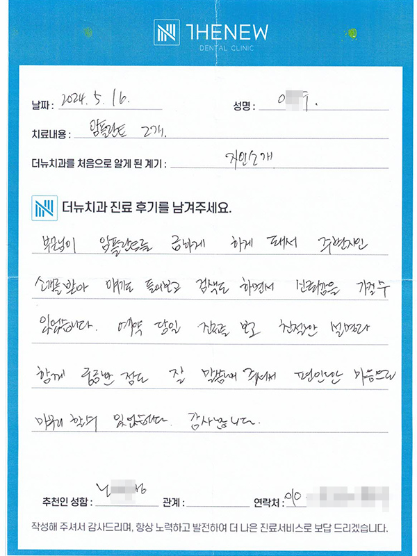 2024년 5월 16일 지인소개 통해 내원해 주신 "이O수"님께서 직접 작성해주신 후기입니다. 부모님이 임플란트를 급하게 하게 돼서 주변지인 소개를 받아 얘기를 들어보고 검색도 하면서 신뢰감을 가질 수 있었습니다.