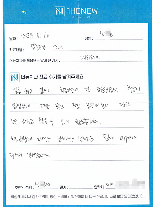 내원해 주신 "노O호"님께서 직접 작성해주신 후기입니다.