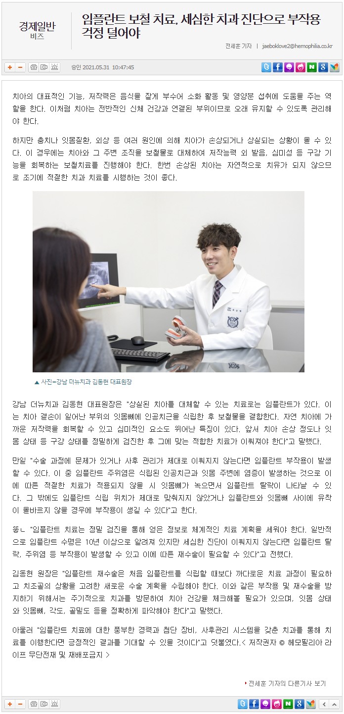 [헤모필리아] 임플란트 보철 치료, 세심한 치과 진단으로 부작용 걱정 덜어야