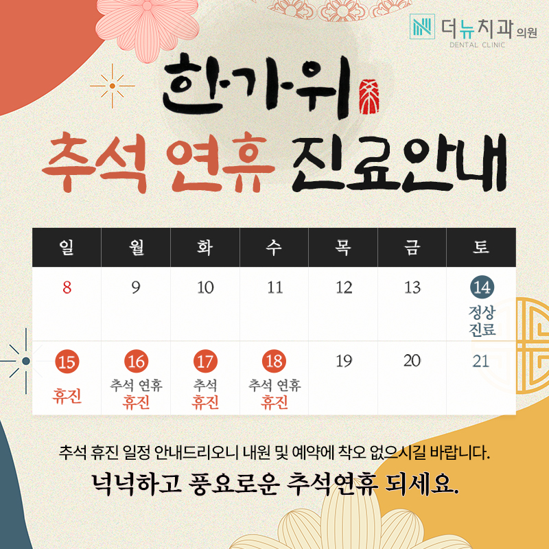오는 9월 추석 연휴 휴진 안내드리오니 진료 예약 및 내원에 착오 없으시길 바랍니다.